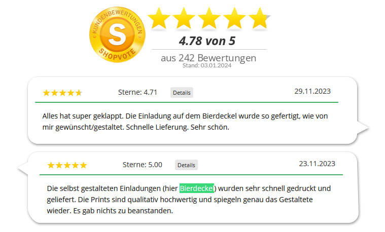 Die Webseite Einladungen-selbst-gestalten.de hat jahrelange Erfahrung im Druck von Bierdeckeln und dort findet ihr aktuell die kreativsten Vorlagen für eure Bierdeckel-Einladung. Schaut einfach dort vorbei und wählt aus einer Vielzahl von Optionen und Designs. Die einfache Gestaltung sowie der einfache Bestellprozess runden die positive Erfahrung ab!